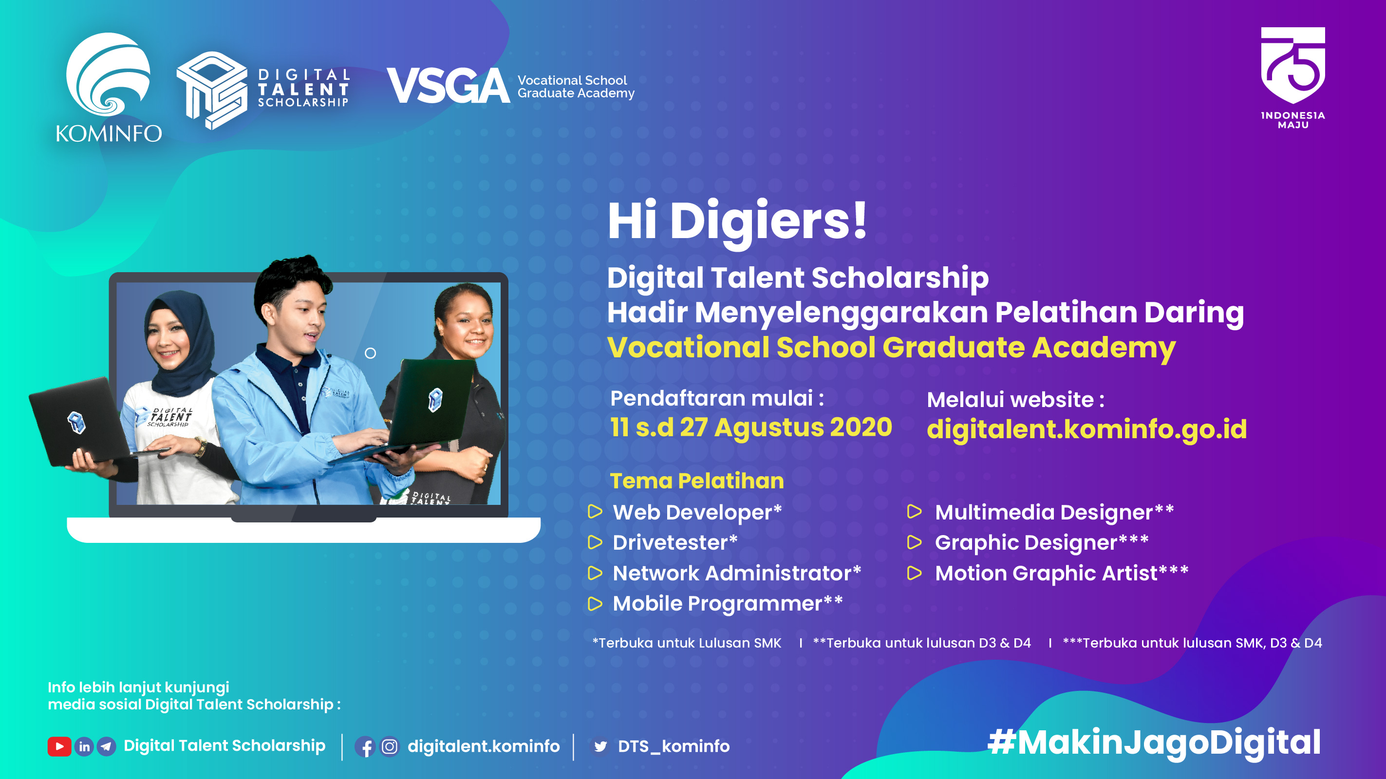 Vocational School Graduate Academy (VSGA) merupakan bagian dari Program Digital Talent Scholarship 2020. Tahun ini, beradaptasi dengan kebiasaan baru, VSGA