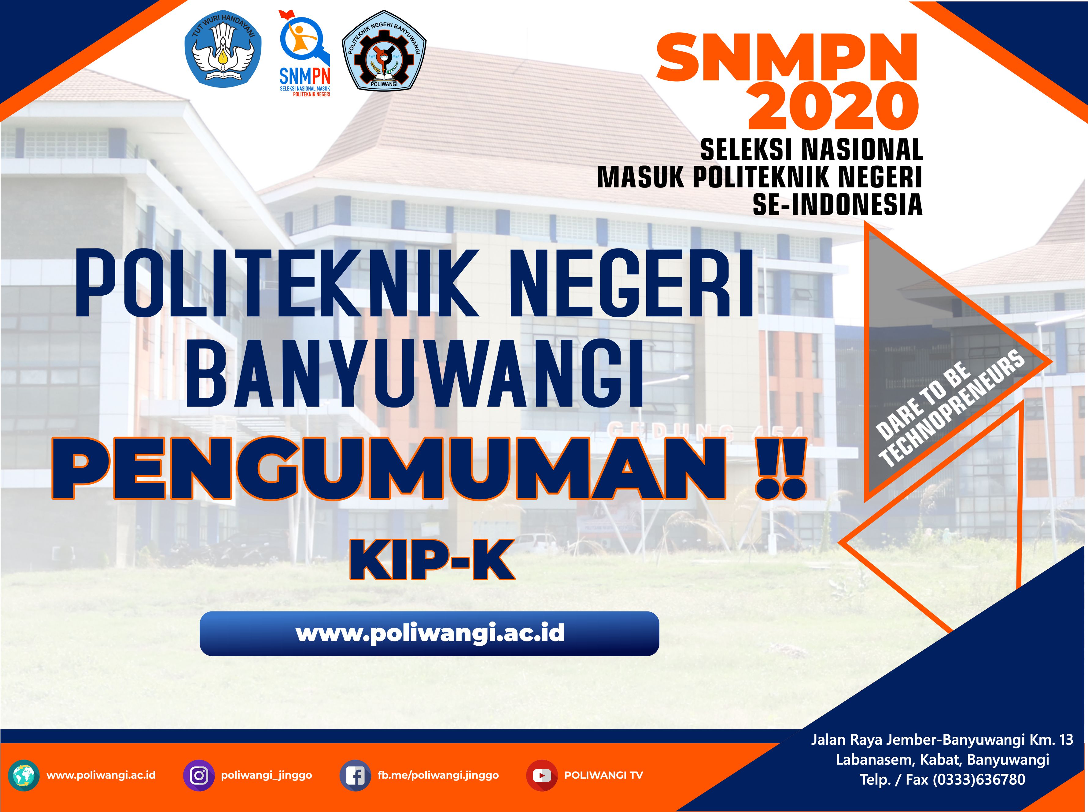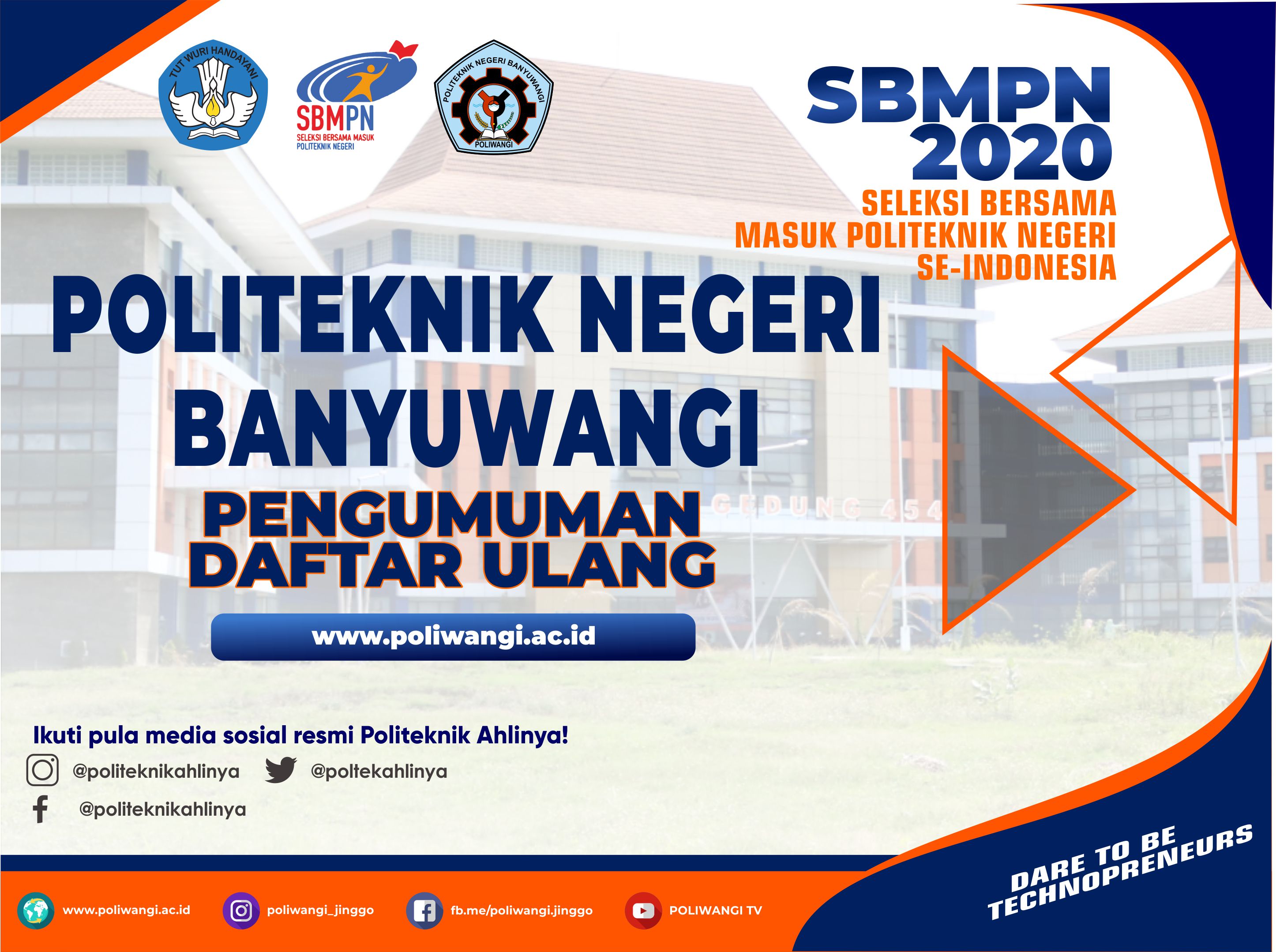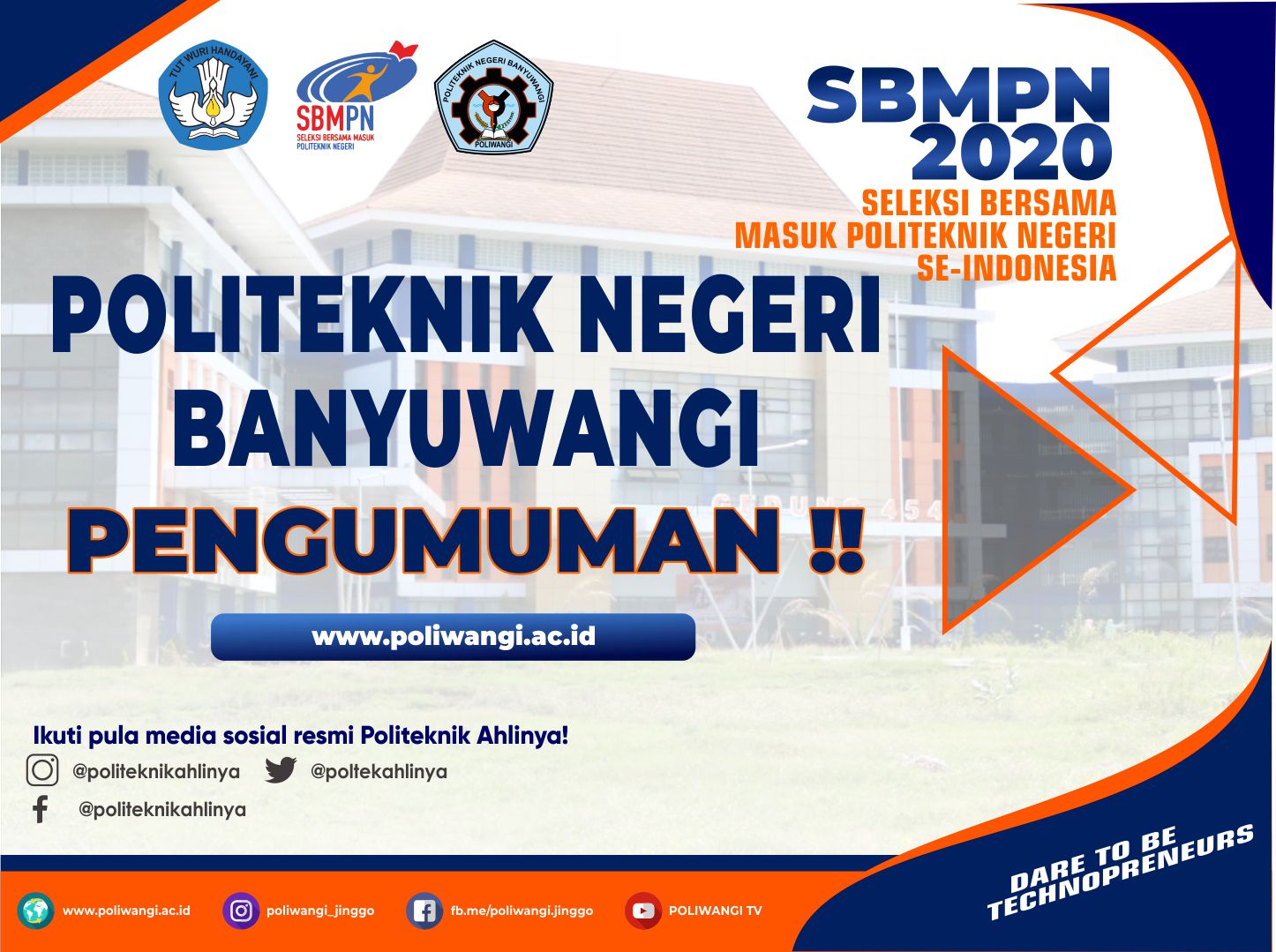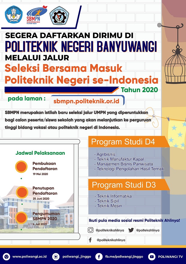 Pengumuman Penerimaan Mahasiswa Baru Politeknik Negeri Banyuwangi Jalur SBMPN 2020 Dapat diakses melalui laman resmi sbmpn.politeknik.or.id Bagi anda calon mahasiswa baru