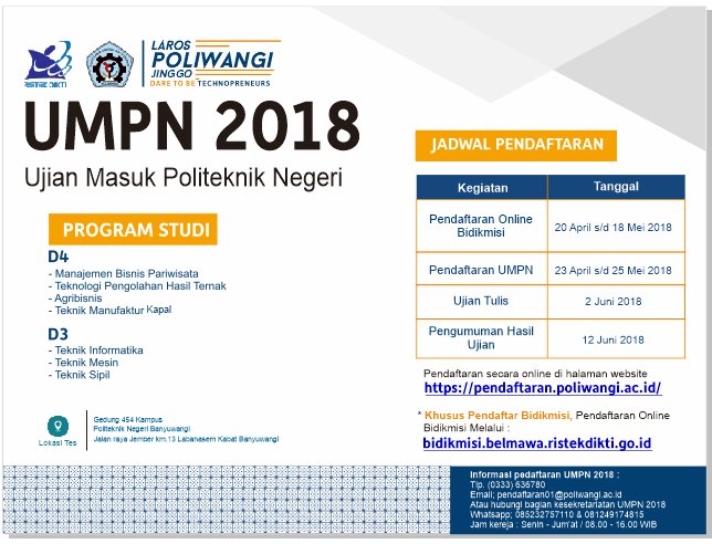 PENGUMUMAN HASIL SELEKSI MAHASISWA BARU POLIWANGI JALUR UMPN 2018 Selamat atas pencapaian anda pada penerimaan mahasiswa baru Politeknik Negeri Banyuwangi