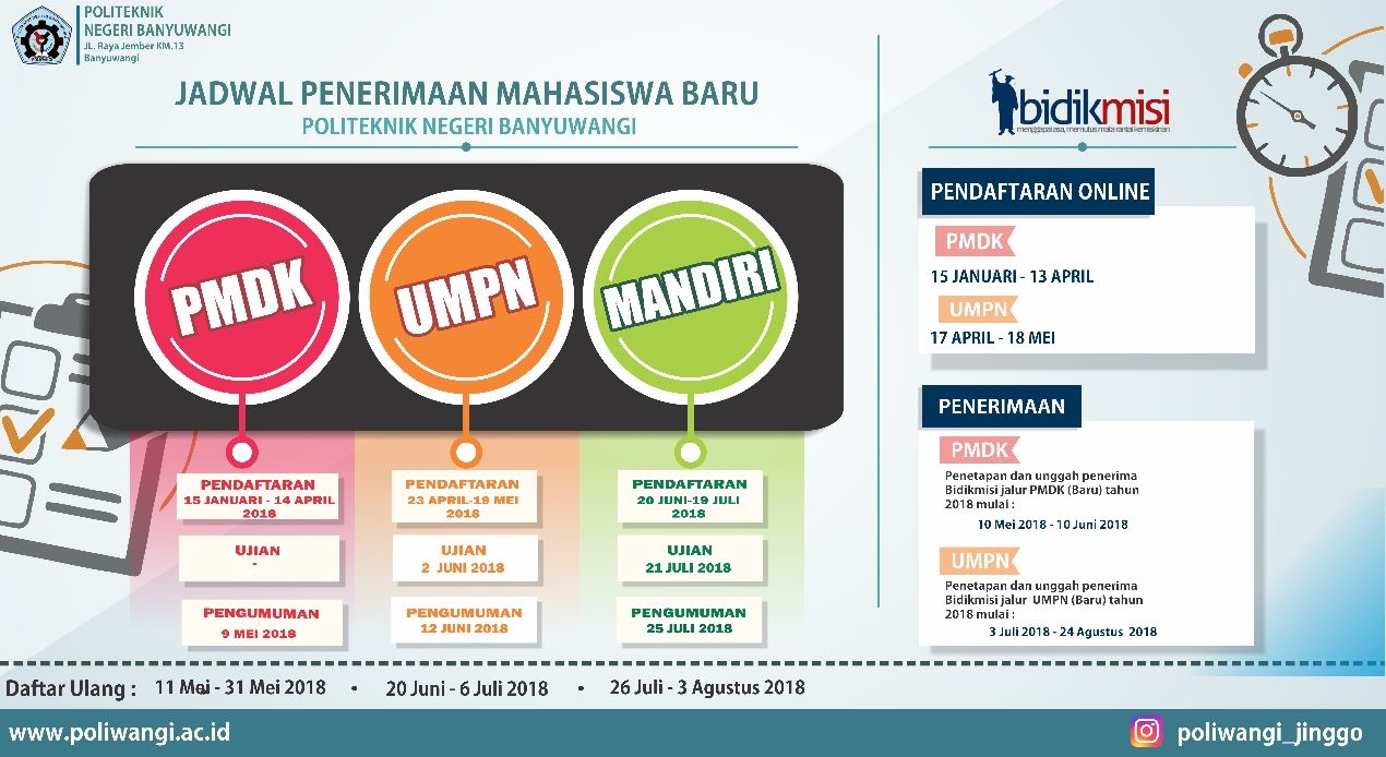 Berdasarkan hasil pengumuman kelulusan Jalur PMDK-PN di Politeknik Negeri Banyuwangi Tahun Akademik 2018-2019, bersama ini dapat disampaikan alur dan jadwal