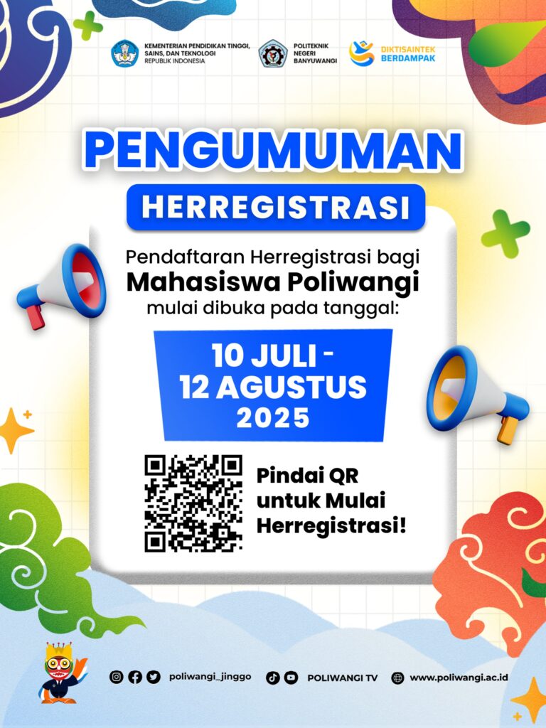 Politeknik Negeri Banyuwangi mengumumkan pelaksanaan Her Registrasi bagi seluruh mahasiswa aktif untuk Semester Ganjil Tahun Akademik 2025/2026. Kegiatan ini dilaksanakan secara daring melalui laman resmi Sistem Informasi Terpadu (SIT) Poliwangi: https://sit.poliwangi.ac.id