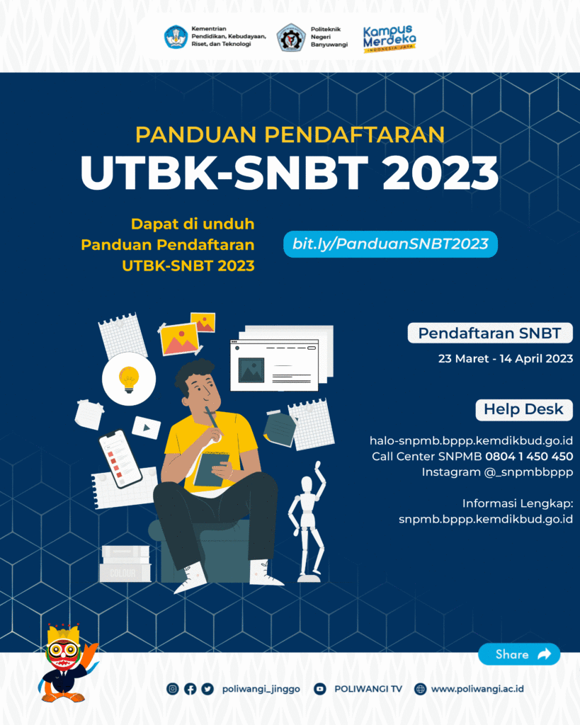 Untuk informasi lebih lanjut mengenai Pendaftaran Mahasiswa Baru dan informasi seputar program studi di Politeknik Negeri Banyuwangi, anda dapat apat mengunjungi media sosial Instagram @poliwangi_jinggo serta informasi umum terkait SNBP bisa dicek pada link https://snpmb.bppp.kemdikbud.go.id/snbp/informasi-umum atau menghubungi call center Politeknik Negeri Banyuwangi di nomor 0823-3274-8132.