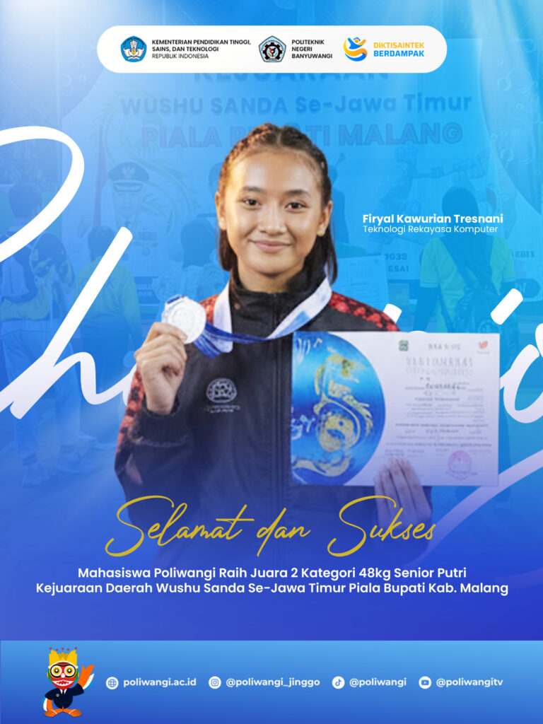 Mahasiswa Politeknik Negeri Banyuwangi kembali menorehkan prestasi membanggakan di tingkat regional. Firyal Kawurian Tresnani, mahasiswa Program Studi Teknologi Rekayasa Komputer Kelas 2A, berhasil meraih Juara 2 Kategori 48 Kg Senior Putri pada Kejuaraan Daerah Wushu Sanda Se-Jawa Timur Piala Bupati Kabupaten Malang.
