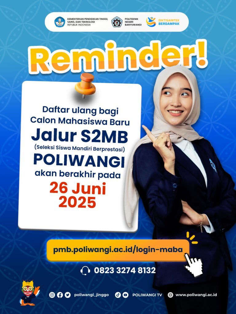 Diberitahukan kepada seluruh Calon Mahasiswa Baru Politeknik Negeri Banyuwangi yang telah dinyatakan lolos melalui Jalur S2MB (Seleksi Siswa Mandiri Berprestasi) bahwa batas akhir daftar ulang adalah pada Kamis, 26 Juni 2025.