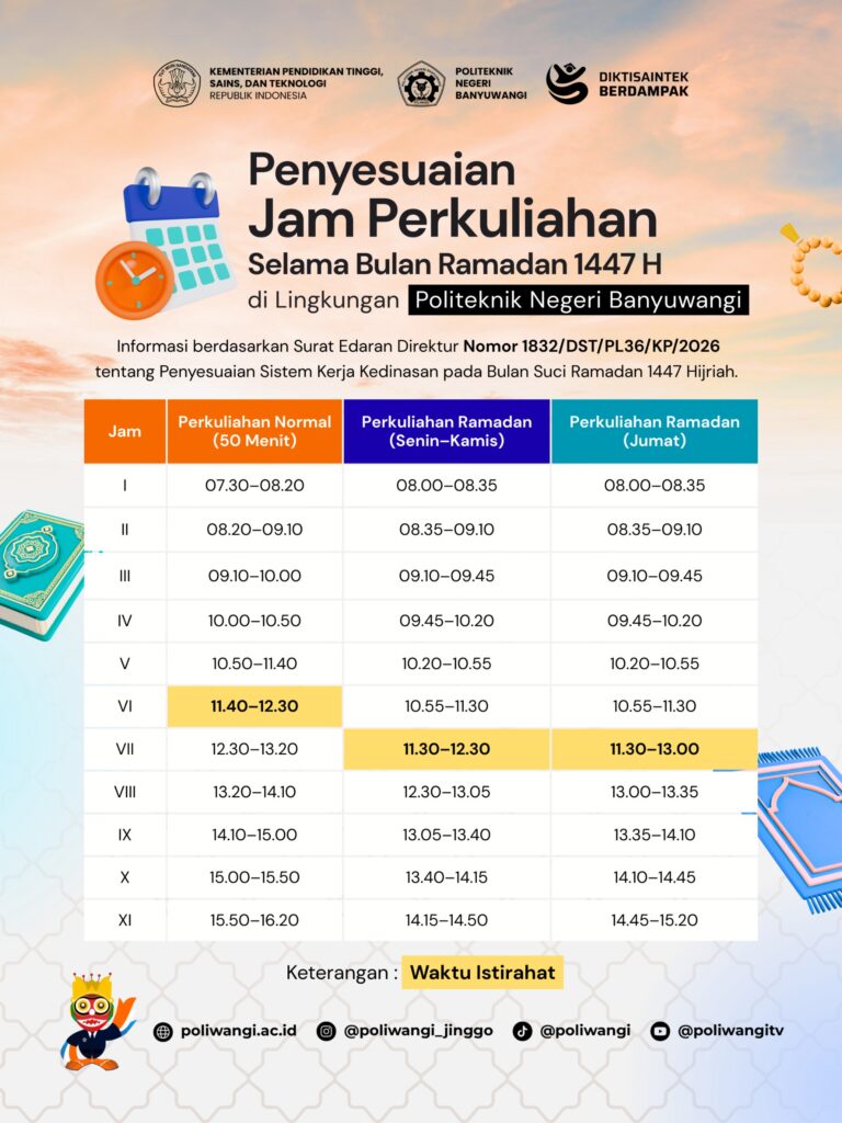 Dalam rangka menyambut Bulan Suci Ramadan 1447 Hijriah, Politeknik Negeri Banyuwangi (Poliwangi) melakukan penyesuaian jam perkuliahan dan jam kerja Aparatur Sipil Negara (ASN) di lingkungan kampus.